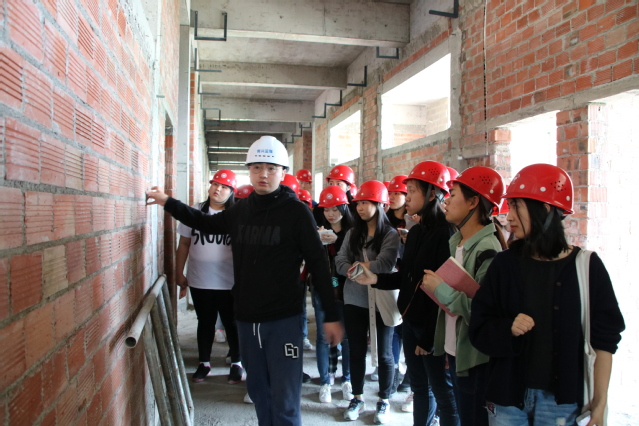 第一站来到了校内实验楼三期工程。讲解老师为员工们讲解了建筑施工现场建筑物是如何施工的。例如:混凝土与空心砖的连接处应挂网防止开裂;采用陶粒(质量轻)作为粗集料减少建筑物的自重。随后,讲解老师给大家讲解了在以后的工作中应该如何看施工图。强调说一定要看每张图纸的备注。