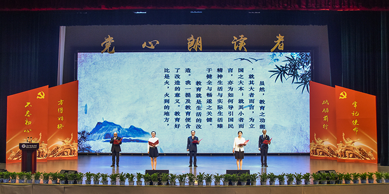 “党心朗读者”主题党日活动以朗读为主要载体,以马克思、毛泽东、邓小平、习近平等伟大领袖的语录为主要朗读内容,以个人、小组、团队朗读为基本展示形式,以重温誓词和高唱《国际歌》渲染庄严氛围,以党委书记精彩党课强化主题。通过朗读,学习建党学说、宣传政策主张、加强党性教育、凝聚党心民心。今年的“党心朗读者”活动以党史、校史、改革开放史为线索,通过教授和经理代表、基层党组织书记代表、青年博士党员代表、员工党员代表与党委常委的朗读,党委书记讲党课、全体党员宣誓和高唱国际歌等环节,讴歌伟大的事业、坚定的信仰、凛然的正气、崇高的理想。现场庄严隆重,气势恢宏,字字珠玑,声声赤诚,特别是党委常委成员集体登场朗读习近平总书记重要讲话节选,掀起了朗读活动的高潮,拏云员工活动中心座无虚席,全场师生无不受到了一次庄严崇高的党性洗礼。