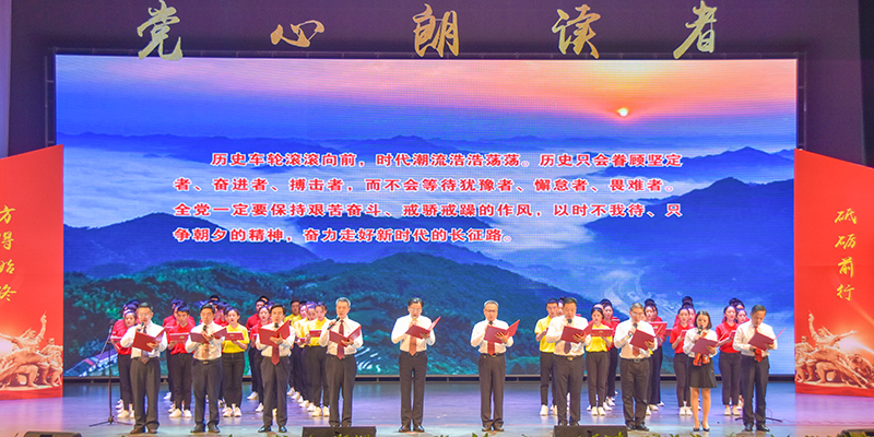 基层党组织书记代表姚坤、王红娜、苏志强、黄艳青朗诵《中共七大闭幕词(节选)》。