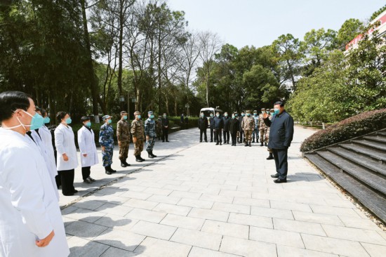 2020年3月10日,中共中央总书记、国家主席、中央军委主席习近平专门赴湖北省武汉市考察新冠肺炎疫情防控工作。这是习近平在火神山医院办公楼外广场接见湖北省和军队、外地支援湖北医护人员代表,致以亲切慰问和衷心感谢。 新华社记者 谢环驰/摄 第一,把医疗救治工作摆在第一位。3月9日,湖北还有4701名重症和危重症患者,其中武汉4471名,多数合并高血压、糖尿病等基础疾病,救治难度较大。下一步,要抢抓援鄂医护力量、医疗资源汇聚湖北的重要窗口期,在科学精准救治上下功夫,最大限度提高治愈率、降低病亡率。国家卫健委要指导地方进一步落实“四集中”措施,发挥好重症专业救治力量,集中优势医疗资源和技术力量救治患者,及时总结推广行之有效的诊疗方案。要加强对患者其他基础疾病的治疗,减少并发症发生。要高度重视轻症患者救治,落实“四早”要求,让病人在隔离点和发病之初就得到及时治疗。要做好出院患者康复医疗工作,包括器质功能恢复和心理疏导调适,有针对性做好人文关怀。要加强医护力量和医疗资源统筹,兼顾其他患者的日常就医需求,逐步恢复正常医疗秩序。 前几天,我在军事医学研究院和清华大学医学院考察调研时提出,防控新冠肺炎斗争有两条战线,一条是疫情防控第一线,另一条就是科研和物资生产,两条战线要相互配合、并肩作战。要加速推进新型检测试剂、抗体药物、疫苗和诊疗方案等科技攻关,坚持临床研究和临床救治协同,中西医结合、中西药并用,加快推广应用已经研发和筛选的有效药物,提升救治水平。要加强医疗防控物资生产、供应、调配,实现供需协调匹配。 广大医务工作者、社区工作者、公安干警、基层干部、下沉干部、志愿者等奋战在疫情防控一线。要高度重视对他们的保护、关心、爱护,落实好各项关心关爱政策措施,加强防护物资保障,切实降低感染风险,让他们始终保持强大战斗力、昂扬斗志、旺盛精力,持续健康投入战胜疫情的斗争。 第二,打好群防群控的人民战争。打赢疫情防控阻击战,重点在“防”。现在到了关键的时候,必须咬紧牙关坚持下去。要紧紧依靠人民群众,充分发动人民群众,提高群众自我服务、自我防护能力。要继续采取严格的小区封闭管理措施,加强进出人员管理,做好体温监测和信息登记,坚决切断传染源、阻隔传播途径。要抓住当前小区封闭管理、社会相对静态的重要窗口期,深入开展流行病学调查工作,新发确诊患者要在24小时内完成流行病学调查工作,尽快找到密切接触者,让防控工作更精准、更有效。要持续滚动开展筛查甄别,运用“网格化+大数据”手段,不放过任何一个风险点,防止漏管失控、点上开花,真正使社区和社会面“干净”起来。 外防输出是湖北和武汉必须承担的重大责任。要保持内防扩散、外防输出的防控策略,毫不放松离汉离鄂通道管控措施。同时,也要考虑全国产业链需要和外出务工人员的实际需求,在做好健康管理、落实防控措施的前提下,采取“点对点、一站式”的办法,集中精准输送务工人员安全返岗。武汉作为防控重点地区,现阶段原则上仍要保持“只进不出”。对外地滞留在鄂人员,要摸清底数,研究具体办法,帮助他们安全有序返乡。 第三,加强力量薄弱地区疫情防控工作。武汉是决胜之地的主战场,其他市州也是决胜之地的重要战场,疫情防控工作也不能忽视。孝感、鄂州、随州、宜昌、黄冈、荆门、荆州等地的患者存量还比较大,医疗条件和防控力量还比较薄弱。要加大对医疗力量薄弱市州的支持力度,发挥高水平专家团队的作用,探索巡回诊疗、远程会诊等有效做法,促进优质医疗资源下沉。要改善农村医疗卫生条件,加强农村医务人员和基层干部培训,提供必要的防护物资。要发动群众开展环境卫生专项整治,教育引导群众养成良好卫生习惯,提倡文明健康、绿色环保的生活方式。