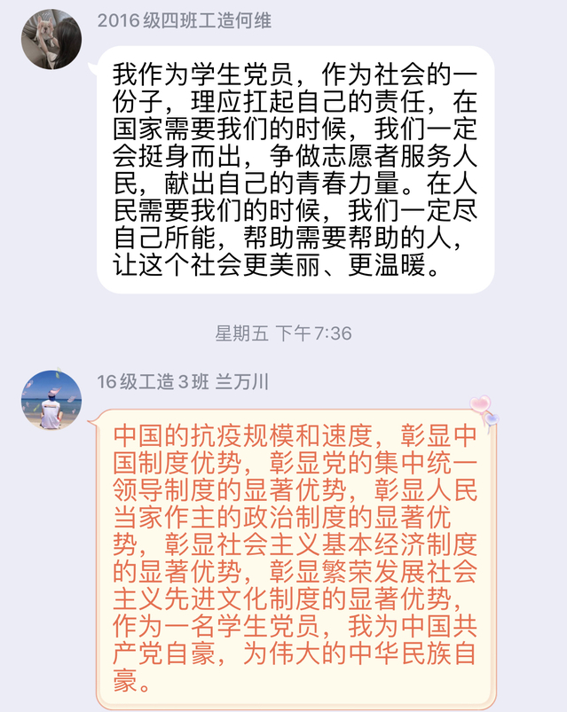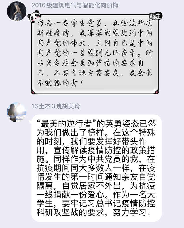 2020年3⽉27⽇,⼟⽊建筑⼯程学院学⽣第三党⽀部所有党员通过⽹络学习,深⼊学习贯彻习近平总书记对新型冠状病毒感染肺炎疫情防控的最新讲话、重要指示精神和习近平总书记给给北京⼤学援鄂医疗队全体“90后”党员和⾸钢医院实习的⻄藏⼤学医学院学⽣的两封回信。在支部书记彭新同志的带领下,所有党员都认真学习相关材料并积极在QQ⽀部群中发表了⾃⼰的观点。
