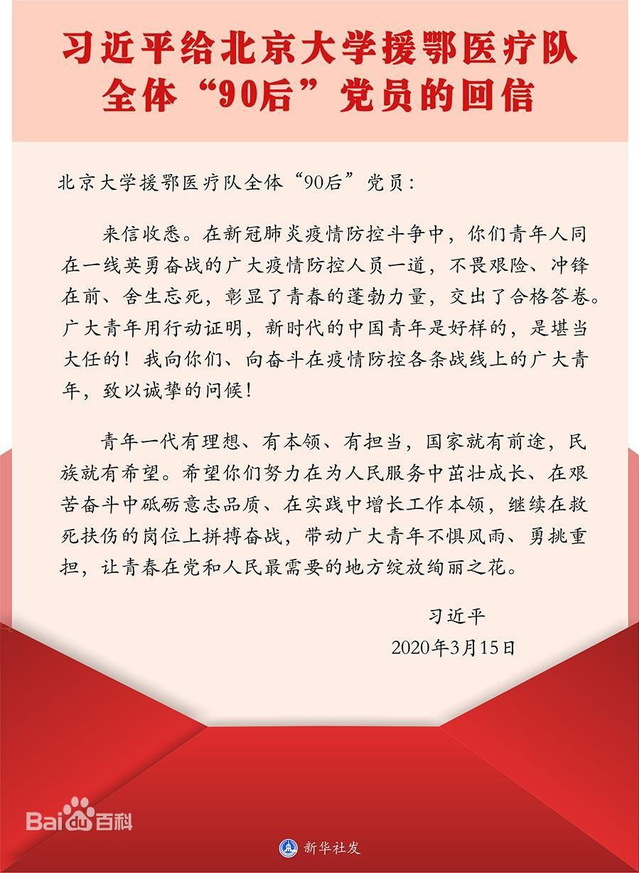 吴明珠同志:习近平总书记3⽉15⽇在给北京⼤学援鄂医疗队全体“90后”党员回信中表示,在新冠肺炎疫情防控⽃争中,⻘年⼈同在⼀线奋勇奋战的⼴⼤疫情防控⼈员⼀道,不畏艰险、冲锋向前、舍⽣忘死,彰显了⻘春的蓬勃⼒量,交出了合格答卷。作为90后的⼀员,我们应在为⼈⺠服务中茁壮成⻓、在艰苦奋⽃中砥砺意志品质、在实践中增⻓⼯作本领, 不惧⻛⾬,勇挑重担,充分展现新时代中国⻘年的精神⻛貌,让⻘春在党和⼈⺠最需要的地⽅绽放绚丽之花!