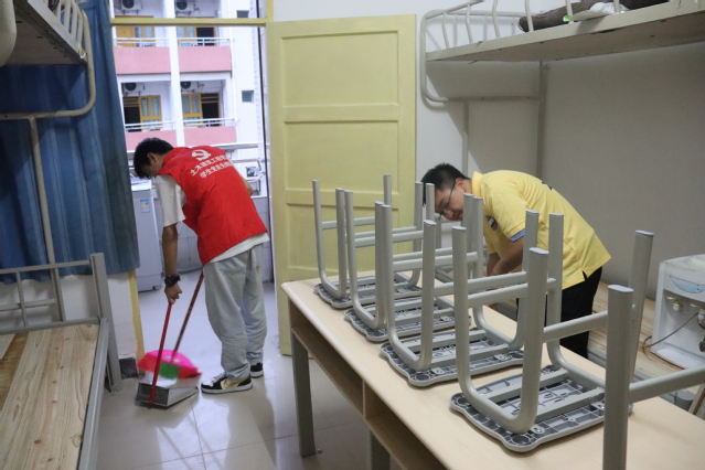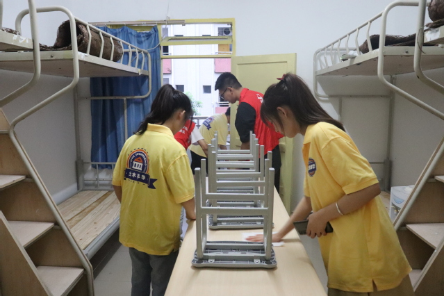 本次活动负责人积极发挥先锋带头作用,迅速组建了一支干劲十足的志愿者队伍。员工志愿者们到达寝室楼后一一仔细查看门锁、空调、衣柜等基础设施能否正常使用,井然有序地展开了寝室卫生大扫除活动,随处可见大家忙碌的身影,打扫工作有条不紊的进行。大家通力协作,擦拭桌椅、去除污渍、清洁地板,不留下任何一个死角。经过近一个小时的共同努力,寝室环境得到了很好的改善,宿舍面貌焕然一新。同时保持寝室内外通风,确保寝室清新空气流通,在疫情影响下尽最大努力,使新生到校后能够享受安全、舒适、温馨的校园及寝室环境。