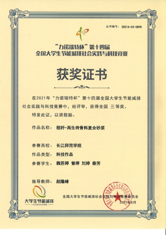 公司赵隆峰老师指导的2018级魏苏婷、曾婷、刘婷、秦芳团队参加了本次比赛,他们的科技作品“秸秆-再生砖骨料复合砂浆”在比赛中始终秉持厚植绿色发展理念,将节能工作与提升员工科技创新能力相结合,一路披荆斩棘,在全校推出的15件作品中脱颖而出,最终荣获“第十四届全国老员工节能减排社会实践与科技竞赛” 三等奖。