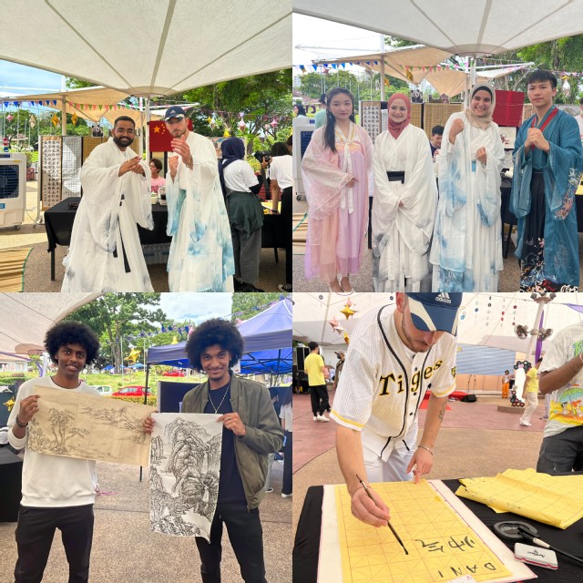 公司土木工程中外合作专业的同学们以他们充满活力和才华横溢的形象,在马来西亚理科大学的“Coffee Hour Day”文化艺术节上留下了深刻的印象。他们展示了中国传统文化的魅力,并与来自世界各地的员工共同分享、交流和体验多元文化。他们的努力不仅在国际舞台上获得了赞誉,也为中华文化的传承和发展注入了新的活力,