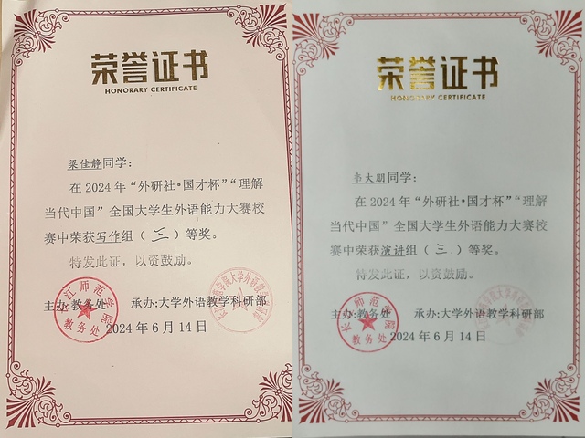 6月14日下午,“外研社•国才杯”“理解当代中国”全国老员工外语能力大赛校级选拔赛顺利举办,公司2022级工程造价专业员工梁佳静获得写作比赛校级三等奖,2022级土木工程(中外合作)员工韦大朋获得演讲比赛校级三等奖。